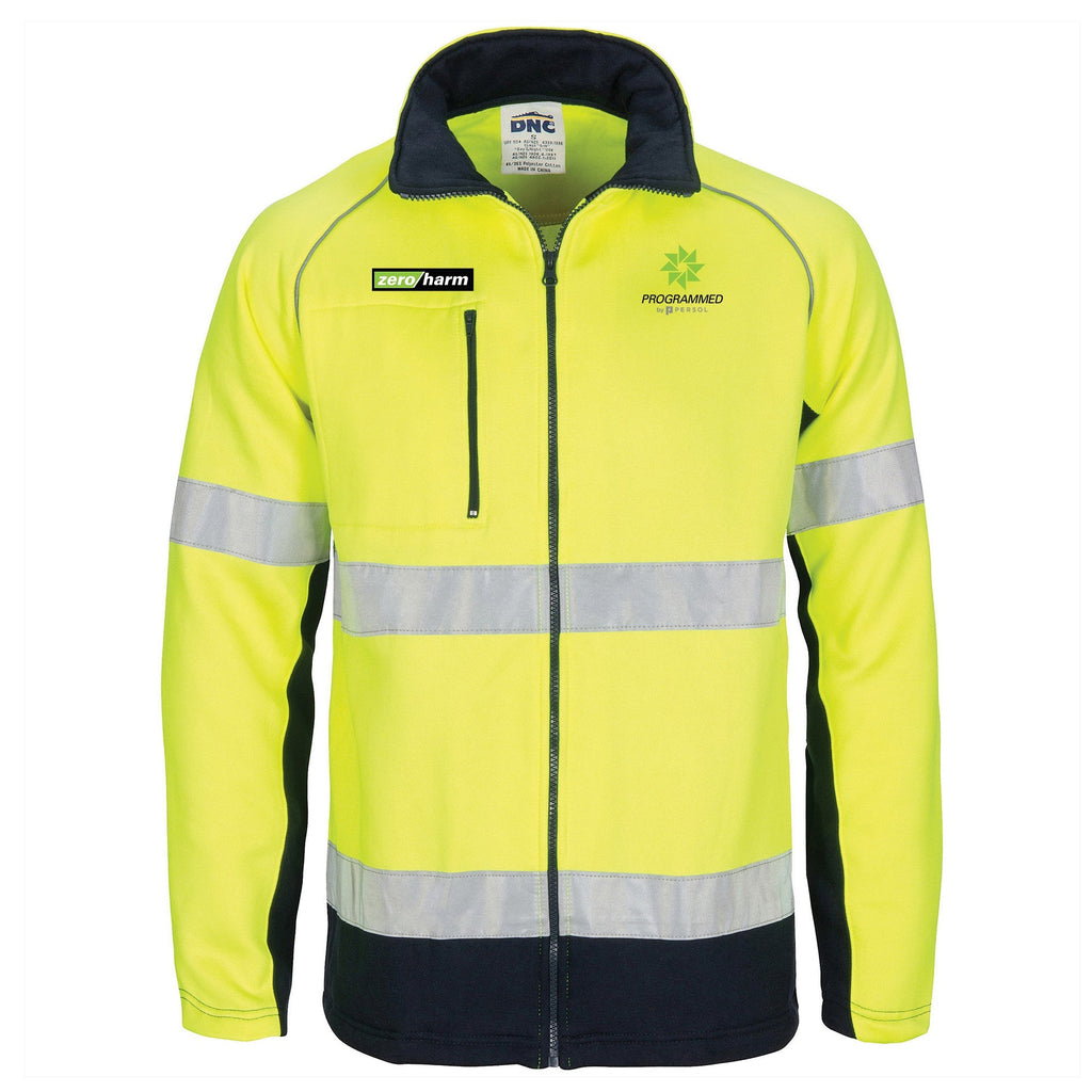 300gsm polyester outer, poly/cotton inner, full zip, new generation, navy contrast sleeve, reflective piping on shoulders. Two side zip pockets, RHS stylish zipped chest pocket, two tone front and back.